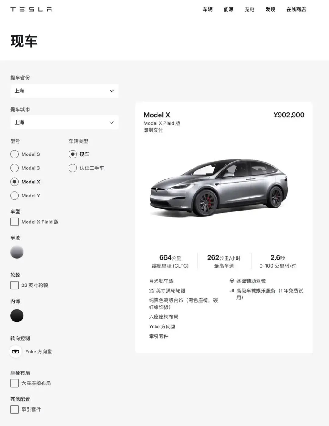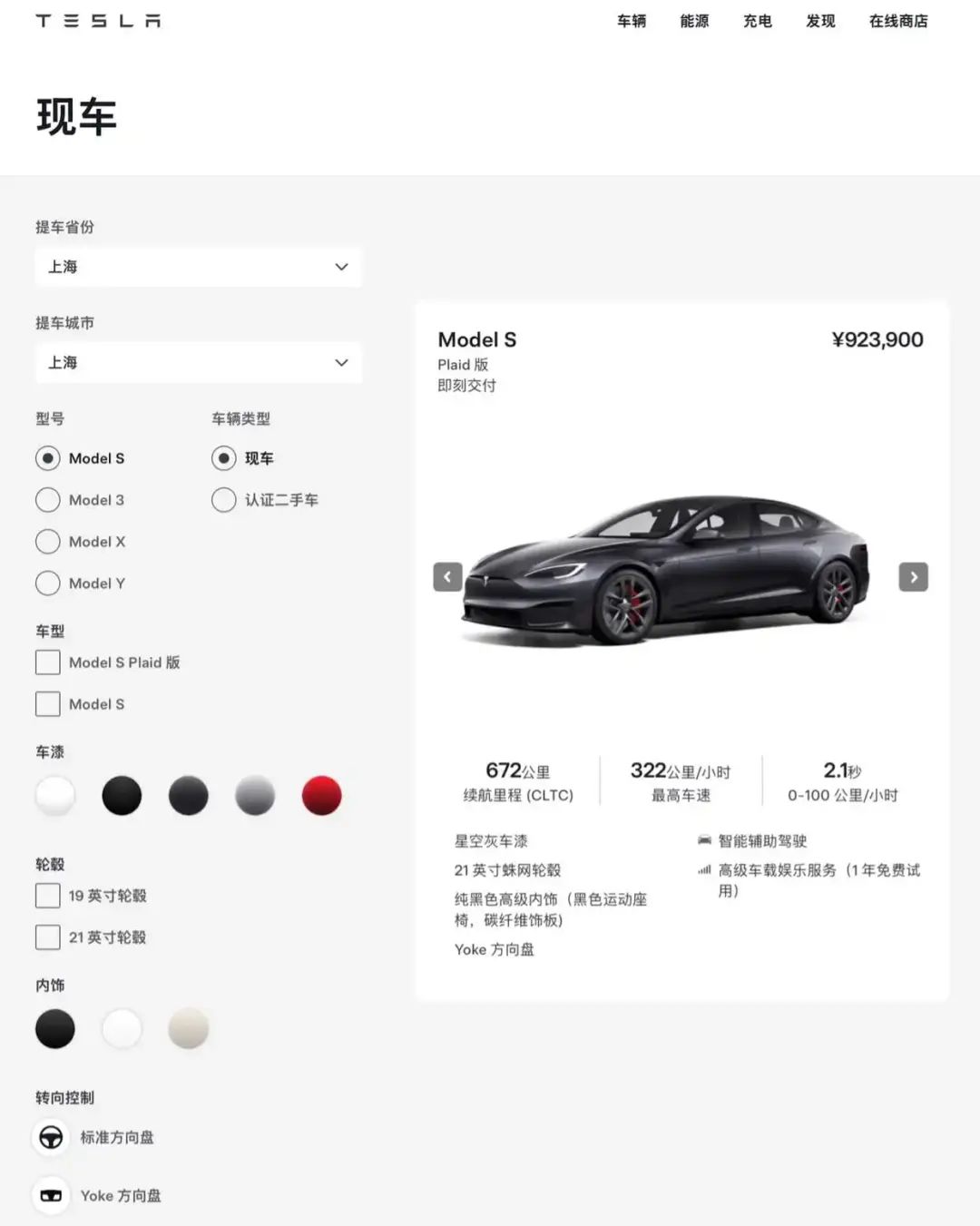 4月11日,特斯拉中国官网显示,目前Model S/X车型已不再提供单独的“订购新车”选项,目前相应车型页面中仅显示有“查看现车”按钮,点击“查看现车”则可以看到一系列车型信息。